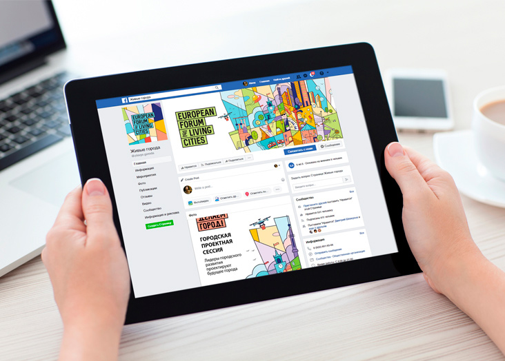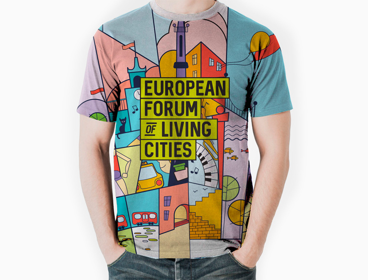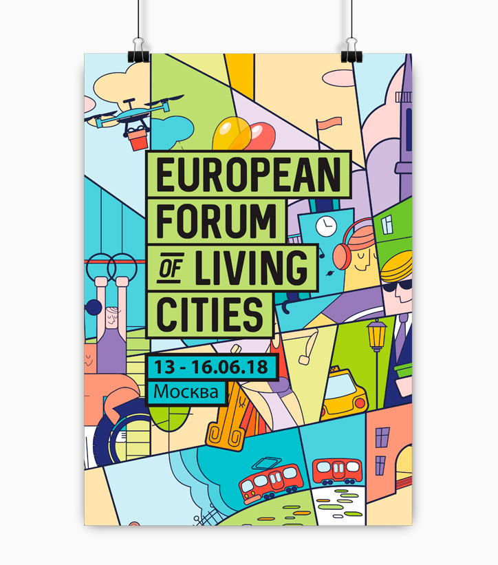 Мы создали для форума фирменный стиль. В его основе — идея оживления среды через оживление самого себя. Для серии постеров мы проиллюстрировали разные сцены городской жизни, которые объединяются в общий сюжет словно элементы мозаики.