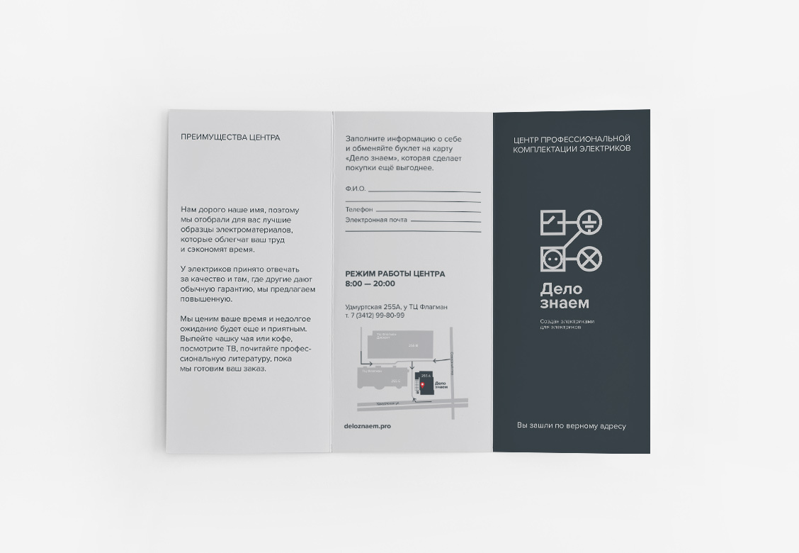 В этом проекте нам было важно не только вывести бренд на рынок, но и сформировать площадку для развития профессиональной среды. «Дело знаем» — не просто центр комплектации для электриков. Разрабатывая стратегию позиционирования, мы хотели сделать магазин также и местом общения электриков. Здесь они не только могут купить необходимые для работы инструменты, но и обменяться опытом с коллегами. Отсюда и название, предложенное агентством.