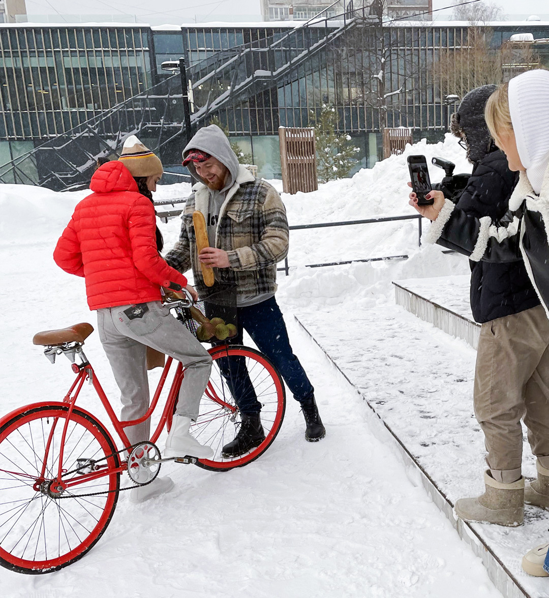 Для большей реалистичности мы сразу отказались от стоковых фото и решили провести фотосессию с командой Александра Маерса. Креативщики «Тринадцатого» на два дня превратились в «серую массу» и покоряли лучшие сугробы города, сохраняя хмурое лицо. Модели почти начали говорить с финским акцентом, стилист, ассистент, декоратор и визажист творили, грелись чаем и создавали красоту. Фотограф ловил кадры и даже один раз свет. В итоге получились яркие фотографии, которые выделялись на в антураже суровой ижевской зимы.