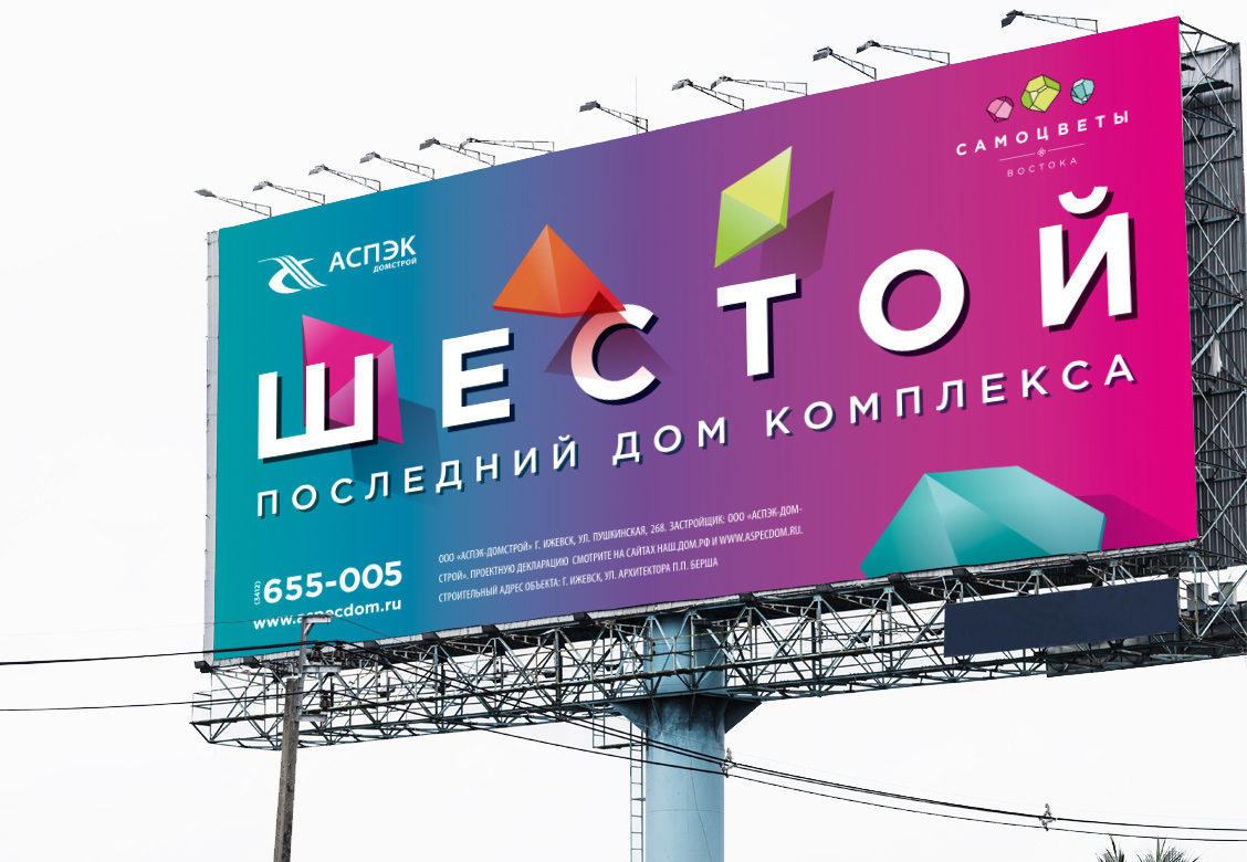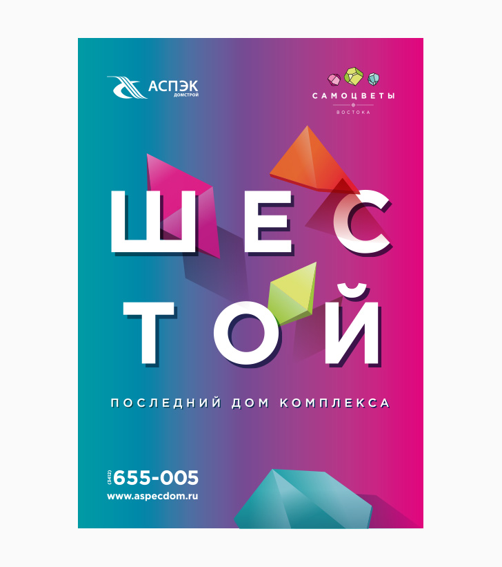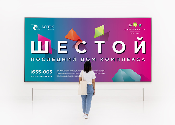 Строительство жилого комплекса «Самоцветы Востока» подходит к концу и завершает всю композицию на улице Берша шестым по счету домом. Эту точку было важно поставить эффектно. Обновление во всем и радужная нота рекламного посыла отражена в более легкой визуальной коммуникации, выраженной в сложном градиентном переливе, узнаваемых элементах бренда и смелом, блокбастерном масштабе рекламного сообщения.